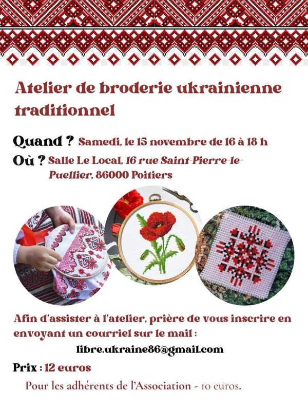 L’association Ukraine Libre vous rappelle que l’atelier de broderie aura lieu le 15 novembre à l’Espace Le Local (Poitiers) de 16h à 18h.